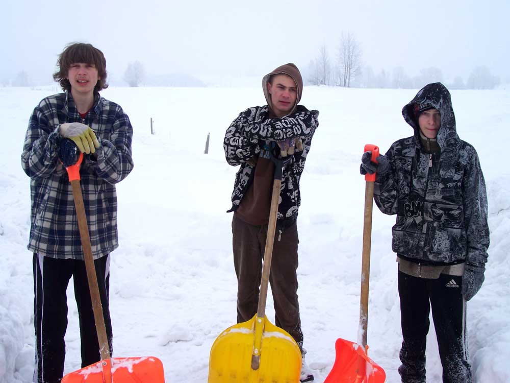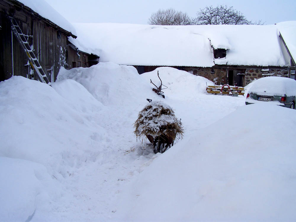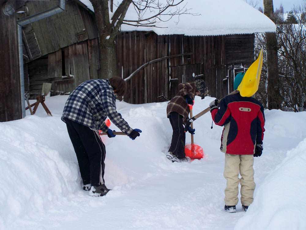 Od pierwszych dni stycznia jesteśmy zasypani śniegiem i odcięci od świata zewnętrznego. Jest jeszcze więcej śniegu niż w poprzednim roku. Śnieg sięga prawie do rynny dachowej, a my regularnie jesteśmy zajęci odśnieżaniem. Sytuacja jest jeszcze gorsza, gdy po śnieżycy cały podjazd zostaje wypełniony twardą warstwą śniegu o grubości do 80 cm. Nic nie da się zrobić bez łopat, dodatkowo – ze względu na szkołę – z ekipy śnieżnej został tylko Thomas. Minie ponad tydzień, zanim podjazd będzie gotowy do jazdy.